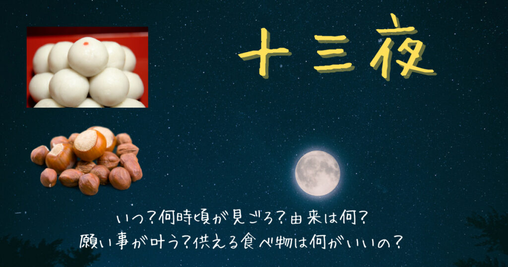 毎年いつなのか?そして、何時頃なのか、とても気になりますよね。それに、なぜ十三夜なのか、その由来も気になります。さらに、十三夜の日には願い事が叶うとも言われています。この日は、どんな食べ物をお供えしたらいいのでしょう。